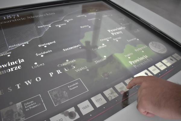 Na piętrze w Książnicy profesora Gerarda Labudy pośrodku sali wystawowej znajduje się intrygujący obiekt, to stół z pozornie nieciekawym niebieskim polem ekranowym. Wszystko zmienia się jednak po jego delikatnym dotknięciu. W pełnej krasie ukazuje się nam dotykowa, interaktywna mapa multimedialna z solidną dawką wiedzy o historii Kaszubów opowiedzianą w nieco inny sposób niż na obrotowych tablicach. Szybko spostrzeżemy, że mamy przed sobą południowe wybrzeże Bałtyku z osią czasu w przedziale od okresu przed Chrystusem aż do schyłku XX wieku. Owe daty szybko zareagują na nasz delikatny dotyk ukazując historię i trwanie Kaszubów na pomorskiej ziemi od wczesnego średniowiecza aż po współczesność. Bez problemu dowiemy się w jakich państwach i na jakim obszarze Pomorza zamieszkiwali Kaszubi w czasach piastowskich, zaborowych, w dwudziestoleciu międzywojennym, II wojny światowej jak i obecnie. Liczne dopowiedzenia w postaci ilustracji i tekstów tylko ułatwiają zrozumienie niezwykle złożonych kaszubskich dziejów. Wnikliwy obserwator dostrzeże, że i tu znalazło się miejsce dla wyjątkowych zabytków, które czekają na nasze odkrycie i poznanie. Jeśli wciąż czujemy niedosyt, gdyż zabrakło nam kojącego głosu i obrazu patrona placówki to odnajdziemy go właśnie tutaj.