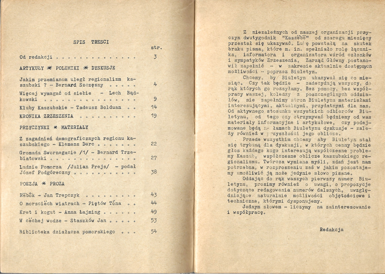 Jaka była zawartość pierwszego numeru ze stycznia 1963 roku? Uwagę zwraca brak stopki redakcyjnej, natomiast wiemy, chociażby ze stopki drukowanej w kolejnych numerach, że „Biuletyn” redagowany był przez Izabellę Trojanowską. Wydawcą był Zarząd Główny Zrzeszenia Kaszubskiego w Gdańsku.