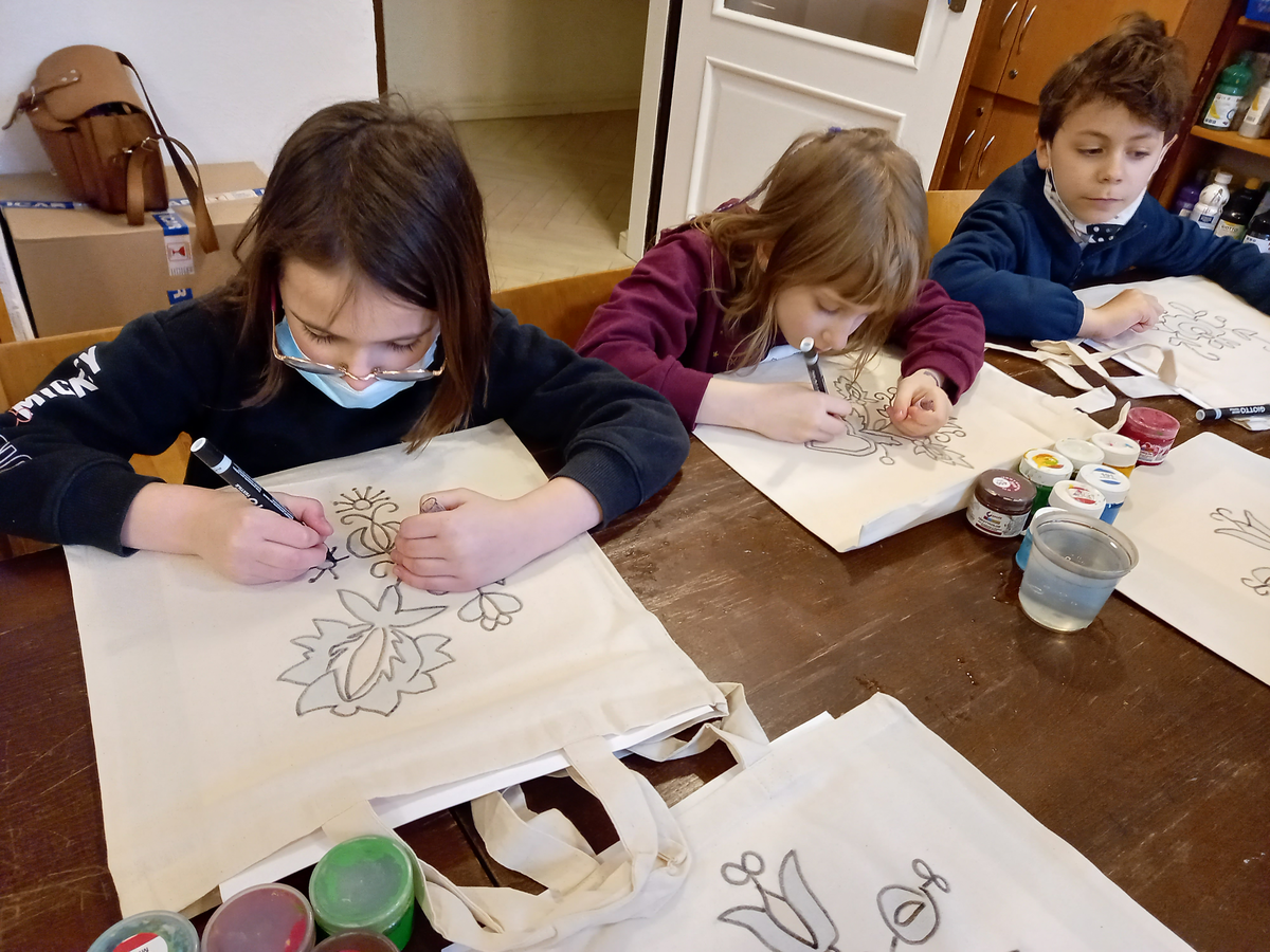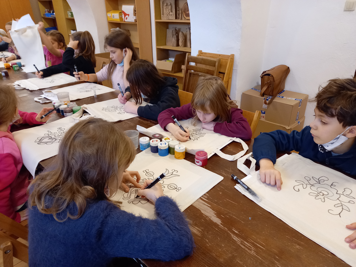 W dniu 23 lutego 2022 roku w Muzeum Piśmiennictwa i Muzyki Kaszubsko- Pomorskiej w Wejherowie, gościli uczniowie uczestniczących w półkoloniach w szkole Kreatywni S.C. z Rumi. Podczas warsztatów zdobili wzorem haftu kaszubskiego ekologiczne torby. Była to też świetna okazja ku temu, żeby powtórzyć sobie kaszubskie nazwy kolorów, przypomnieć sobie czym jest haft i na czym polega sztuka haftowania. Uczniowie mogli też eksperymentować tworząc własny układ barw w hafcie. Jednocześnie każdy zyskał przedmiot użytkowy, który z pewnością będzie mógł wykorzystać, w szkole czy na zakupach.