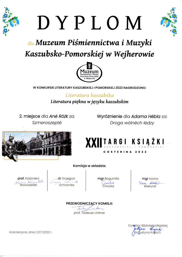 W sobotę 2 lipca 2022 roku, w Kościerzynie odbyły się XXII Targi Książki Costerina 2022. Targi te co roku przyciągają miłośników książek. Połączone są z ogłoszeniem wyników konkursu literatury kaszubskiej oraz pomorskiej. Jest to też okazja dla Wydawnictw oraz autorów, by zaprezentować swój dorobek. Muzeum Piśmiennictwa  i Muzyki Kaszubsko- Pomorskiej, może poszczycić się jako wydawca znaczną ilością publikacji, które doceniane są przez znawców literatury oraz czytelników. W bieżącym roku Muzeum może pochwalić się II miejscem za publikację Anny Różek ,,Szmeroszeptë’’ oraz wyróżnieniem dla publikacji Adama Hebla ,,Droga wòlnëch lëdzy’’, którego współwydawcą jest Gminny Ośrodek Kultury w Luzinie. Obie nagrody przyznano w kategorii literatura piękna w języku kaszubskim. Dodatkowo, I miejsce w kategorii beletrystyka, podręczniki i książki edukacyjne dla młodego odbiorcy, otrzymał nasz pracownik Dariusz Majkowski wraz z żoną Aleksandrą, za książkę ,,Ùcz sã jãzëka z kaszëbsczima nótama’’. Gratulujemy autorom i zachęcam do korzystania z muzealnej oferty wydawniczej.