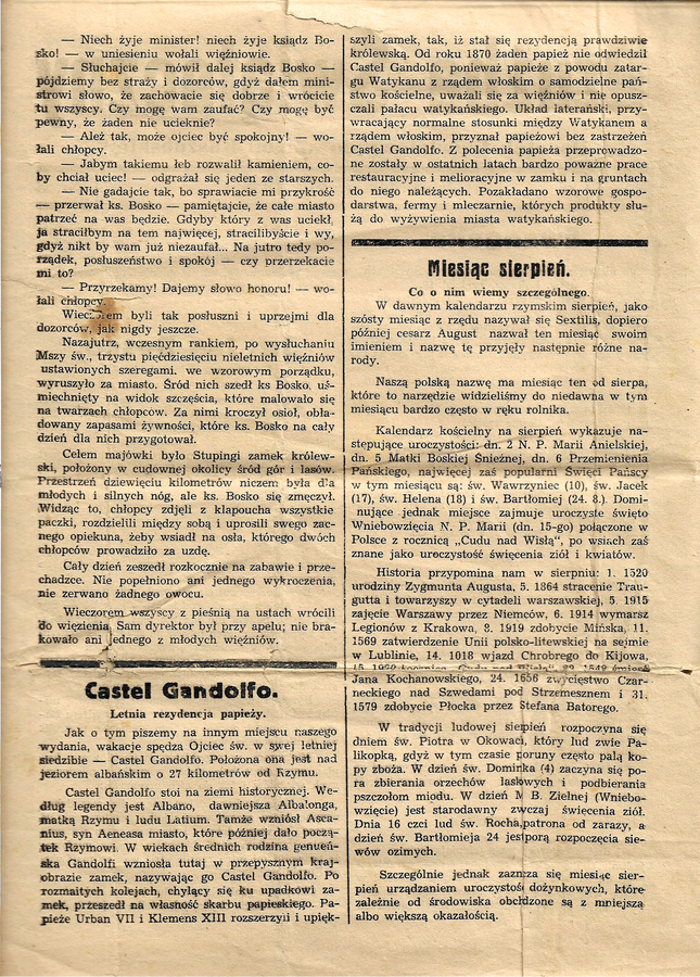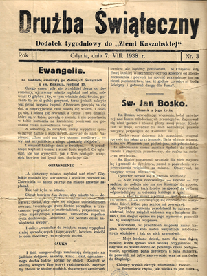 „Drużba Świąteczny” z 7 sierpnia 1938 roku jest dość charakterystycznym i reprezentatywnym przykładem dodatków do prasy codziennej i cokilkudniowej, stąd też warty jest odnotowania. Jak w wielu pismach z międzywojennych Kaszub, nie mogło i w nim zabraknąć wątków religijnych. Dlatego mamy tu czytanie z Ewangelii św. Łukasza na niedzielę, obrazek z życia św. Jana Bosko i opis rezydencji z Castel Gandolfo. Czytelnik znajdzie w „Drużbie” również kalendarium kościelne i dotyczące historii Polski na sierpień oraz artykuł o perspektywach odzyskania przez Kościół katolicki z rąk protestantów świątyni na Helu.