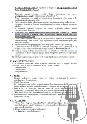 - Organizatorzy Festiwalu zachęcają do uwzględnienia w repertuarze utworu opartego o tekst modlitwy „Pater Noster”. Jego wykonanie zostanie uhonorowane przez jury dodatkową nagrodą.
