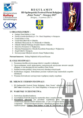 - III Ogólnopolski Festiwal Pieśni Religijnej „Pater Noster” odbędzie się 3 czerwca 2017 roku w kościele p.w. Św. Marii Magdaleny w Strzepczu ul. Ks. Rotty 9.