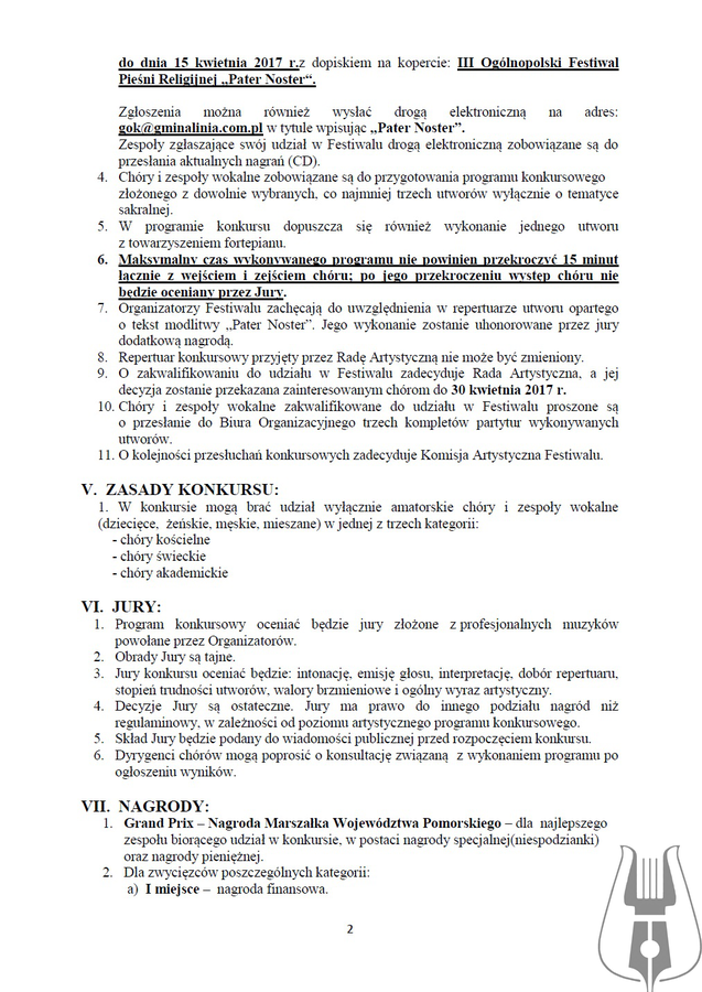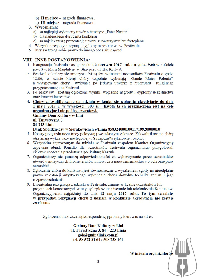 - Warunkiem zgłoszenia jest przesłanie wypełnionej karty zgłoszenia wraz z kolorowym zdjęciem chórów formacie min.: 13 cm x 18 cm oraz kasetą lub płytą CD z nagraniem dwóch dowolnych utworów z aktualnego programu chóru na adres biura organizacyjnego - Gminny Dom Kultury w Lini, ul. Turystyczna 3, 84-223 Linia, do dnia 15 kwietnia 2017 r.z dopiskiem na kopercie: III Ogólnopolski Festiwal Pieśni Religijnej „Pater Noster“.