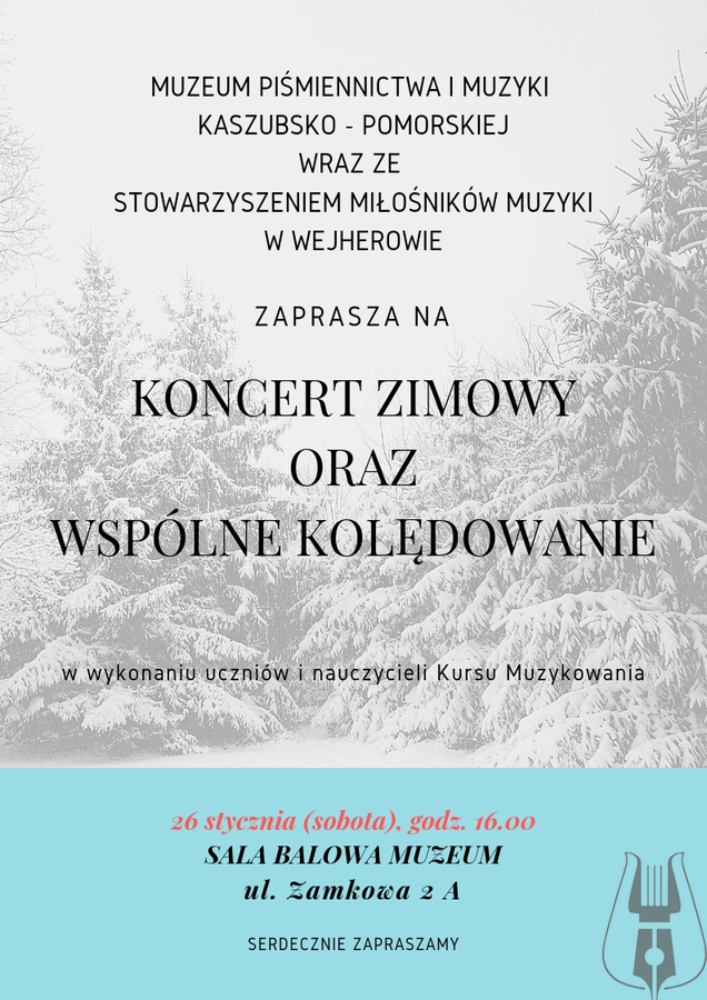 Stowarzyszenie Miłośników Muzyki wraz z Muzeum Piśmiennictwa i Muzyki Kaszubsko-Pomorskiej w Wejherowie serdecznie Państwa zapraszają na koncert kolęd!