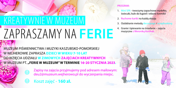Muzeum Piśmiennictwa i Muzyki Kaszubsko-Pomorskiej w Wejherowie zaprasza dzieci w wieku 7-10 lat do wzięcia udziału w zimowych zajęciach kreatywnych w muzeum pt. „Ferie w muzeum” w terminie 16-20 stycznia 2023 :)