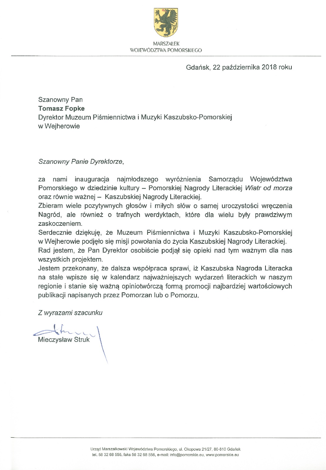 List od Marszałka Województwa Pomorskiego Mieczysława Struka. Dziękujemy