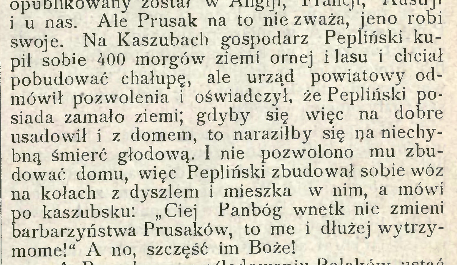 Pamiętać jednak trzeba, że dwa lata przed Drzymałą, Kaszub ze Skorzewa – Franciszek Pepliński, właśnie w taki sposób walczył z pruskim bezprawiem. W 1907 roku pisano o tym m.in. w "Tygodniku Ilustrowanym" czy piśmie "Zaranie".