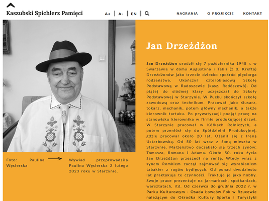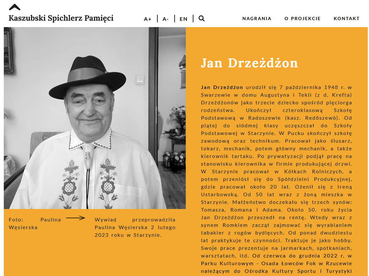 Jan Drzeżdżon urodził się 7 października 1948 r. w Swarzewie. Od ponad dwudziestu lat zajmuje się wyrabianiem tabakier w rogów bydlęcych, czego m. in. dotyczą jego opowieści. Oprócz tego warto posłuchac legendy o tym, jak tabaka pojawiła się na Kaszubach, kolejnych etapach przygotowania tego „diableskiego ziela”, czy zespołach gwiazdorów i maszkar zwierzęcych odwiedzających domy pod koniec adwentu lub w wigilię Bożego Narodzenia. Te i inne wspomnienia dostępne na stronie projektu!