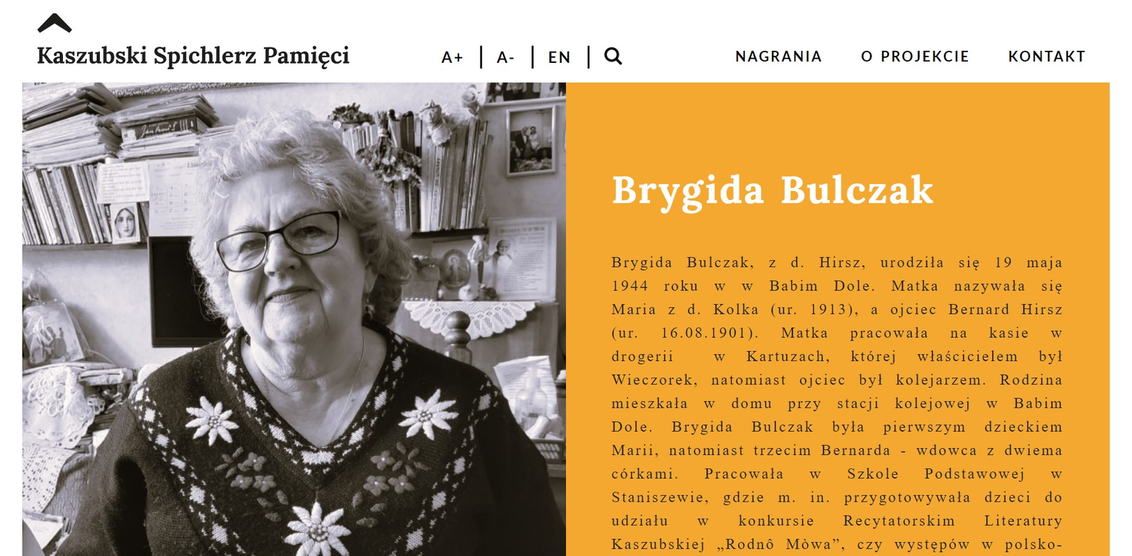 Kaszubski Spichlerz Pamięci, projekt, który zainicjowany został dzięki dofinansowaniu ze środków Muzeum Historii Polski w ramach programu „Patriotyzm Jutra”, i który prowadzony jest przez Muzeum Piśmiennictwa i Muzyki Kaszubsko-Pomorskiej w Wejherowie, prezentuje wspomnienia pani Brygidy Bulczak z Kartuz.