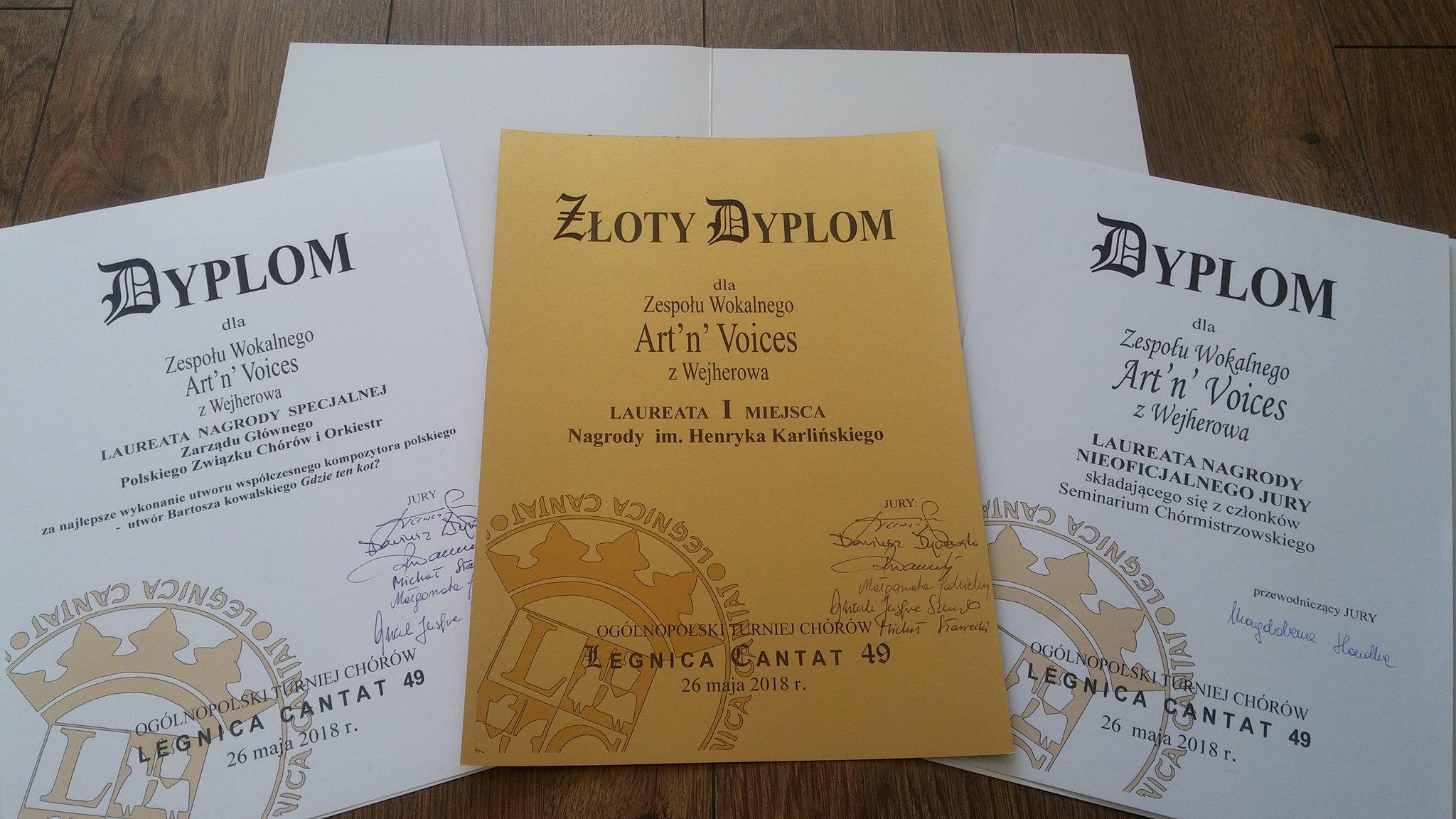 Pierwsze miejsce w złotym paśmie zdobył zespół Art’n’Voices, w składzie: Małgorzata Priebe, Maria Krueger, Anna Rocławska-Musiałczyk, Marta Jundziłł, Mateusz Warkusz, Szymon Duraj, Tomasz Chyła, Filip Czajkowski. Śpiewacy zostali docenieni również przez nieoficjalne jury festiwalu (zorganizowane dla dyrygentów chórów, muzyków i muzykologów, w ramach Ogólnopolskiego Turnieju Chórów) i otrzymali od nich nagrodę Grand Prix. Art’n’Voices zdobyło również nagrodę specjalną Zarządu Głównego Polskiego Związku Chórów i Orkiestr za najlepsze wykonanie utworu współczesnego kompozytora polskiego utwór Bartosza Kowalskiego „Gdzie ten kot?”. Trzy nagrody na osiem osób, to naprawdę świetny wynik. Tym bardziej że w turnieju nie było wyznaczonej osobnej kategorii dla zespołów kameralnych. Art’n’Voices rywalizowało więc z dużymi, kilkudziesięcioosobowymi chórami.