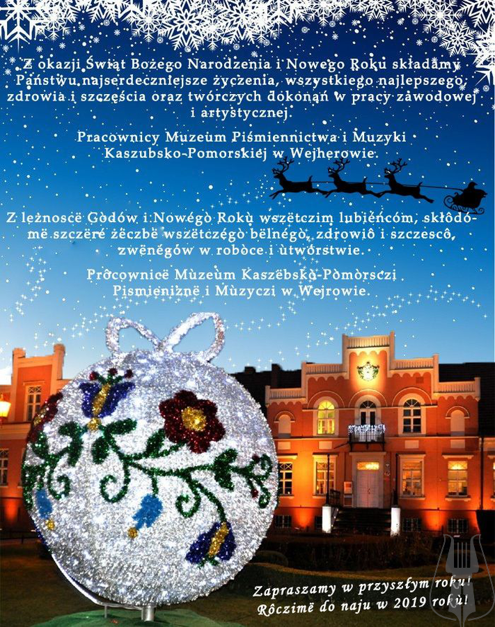 Muzeum Piśmiennictwa i Muzyki Kaszubsko-Pomorskiej w Wejherowie składa Państwu najlepsze życzenia z okazji Świąt Bożego Narodzenia i Nowego Roku.