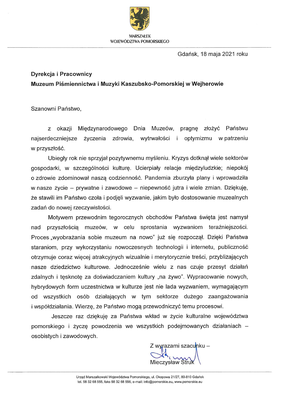 Muzeum Piśmiennictwa i Muzyki Kaszubsko-Pomorskiej w Wejherowie pragnie bardzo serdecznie podziękować Panu Mieczysławowi Strukowi Marszałkowi Województwa Pomorskiego za życzenia złożone z okazji Międzynarodowego Dnia Muzeów.