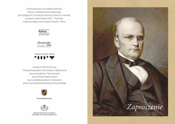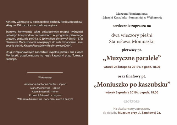 Muzeum Piśmiennictwa i Muzyki Kaszubsko-Pomorskiej w Wejherowie serdecznie zaprasza na dwa wieczory pieśni Stanisława Moniuszki: pierwszy pt. „Muzyczne paralele”, wtorek 26 listopada 2019 r. o godz. 18.00 oraz finałowy pt. „Moniuszko po kaszubsku”, wtorek 3 grudnia 2019 r. o godz. 18.00