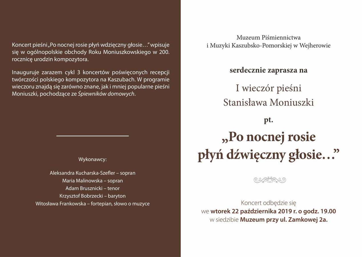 Muzeum Piśmiennictwa i Muzyki Kaszubsko-Pomorskiej w Wejherowie serdecznie zaprasza na I wieczór pieśni Stanisława Moniuszki, pt. „Po nocnej rosie płyń wdzięczny głosie…”