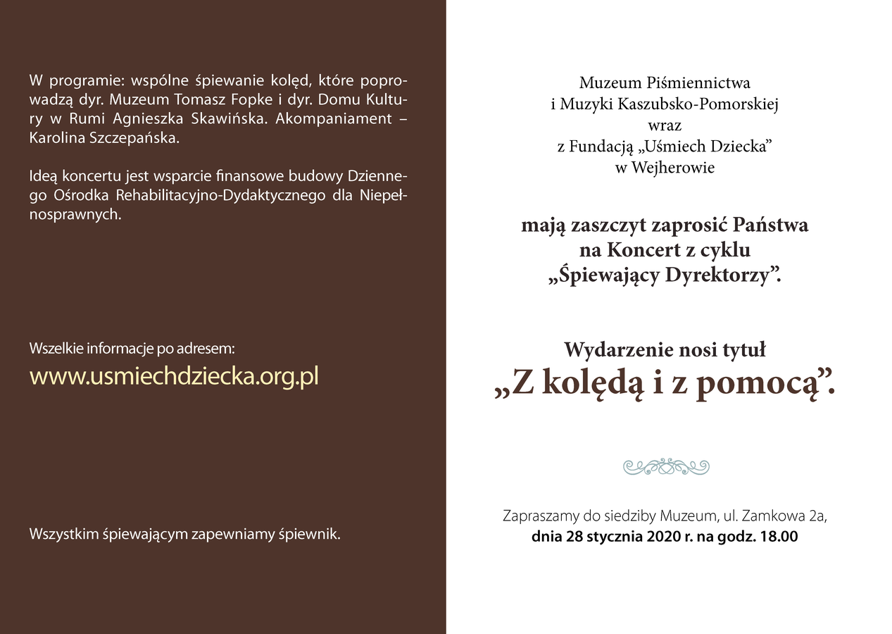 Muzeum Piśmiennictwa i Muzyki Kaszubsko-Pomorskiej wraz z Fundacją „Uśmiech Dziecka” w Wejherowie mają zaszczyt zaprosić Państwa na II Koncert z cyklu „Śpiewający Dyrektorzy”, który nosi tytuł „Z kolędą i z pomocą”.