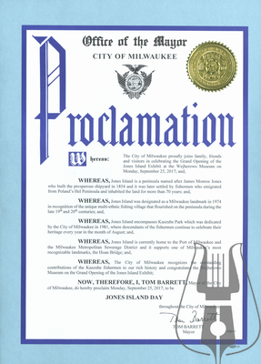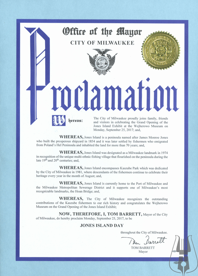 Na zakończenie swego wystąpienia Prelegentka przekazała na ręce dyrektora Muzeum Tomasza Fopke cenny dokument – deklarację, podpisaną przez burmistrza Miasta Milwaukee Toma Barrentta, ustanawiającą „Jones Island Day ( Dzień Wyspy Jonesa)” na 25 września, by podkreślić rangę współpracy z wejherowskim Muzeum - upamiętnić datę otwarcia wystawy i wystąpienia dr Gurnack.