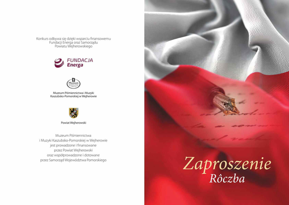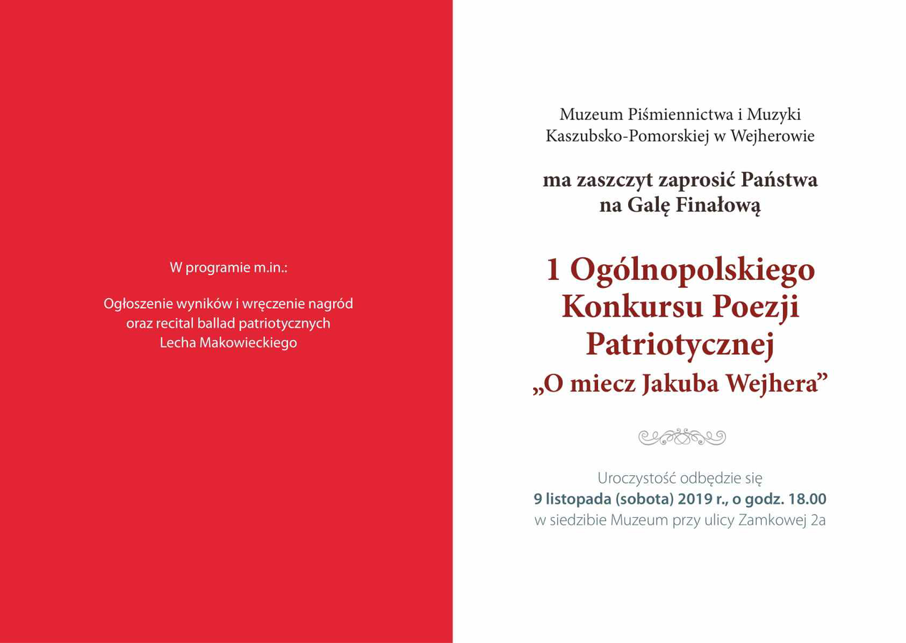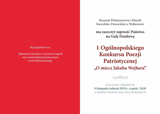 Muzeum Piśmiennictwa i Muzyki Kaszubsko-Pomorskiej w Wejherowie serdecznie zaprasza na uroczyste rozstrzygnięcie 1 Ogólnopolskiego Konkursu Poezji Patriotycznej „O miecz Jakuba Wejhera”, 9 listopada (sobota) 2019 r., o godz. 18.00, w siedzibie Muzeum przy ulicy Zamkowej 2a.