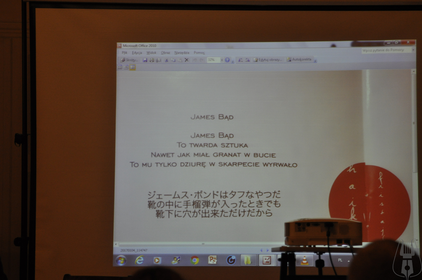 Dr hab. Adela Kuik-Kalinowska, prof. Akademii Pomorskiej w Słupsku, literaturoznawca specjalizującą się m.in. w kulturze Wschodu przybliżyła zebranym historię powstania, kompozycję oraz istotę haiku, jako sedna japońskiej poezji zawierającego w sobie filozofię zen oraz minimalizm. Witold Bobrowski, nauczyciel języka kaszubskiego, tłumacz na język kaszubski XIII-wiecznej antologii wierszy japońskich, przedstawił przykłady swojej twórczości w języku kaszubskim. Gościem spotkania był również Dariusz Brzóska Brzóskiewicz dramatopisarz, twórca telewizyjny i radiowy, ale przede wszystkim poeta i czołowy polski twórca haiku, który w niezwykle finezyjny i dowcipny sposób zaprezentował swoje utwory, również w japońskim tłumaczeniu.