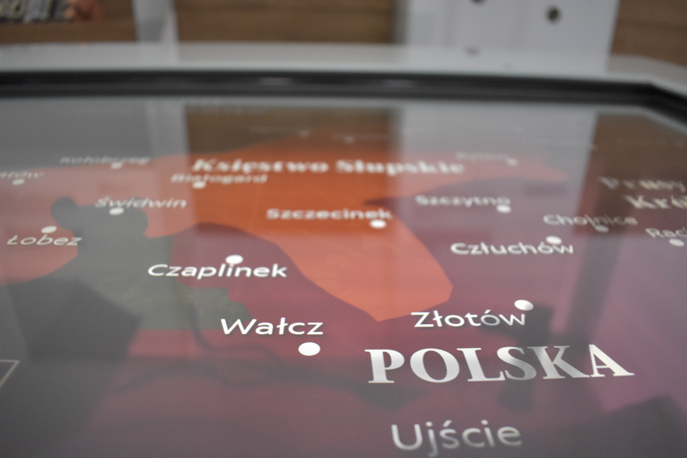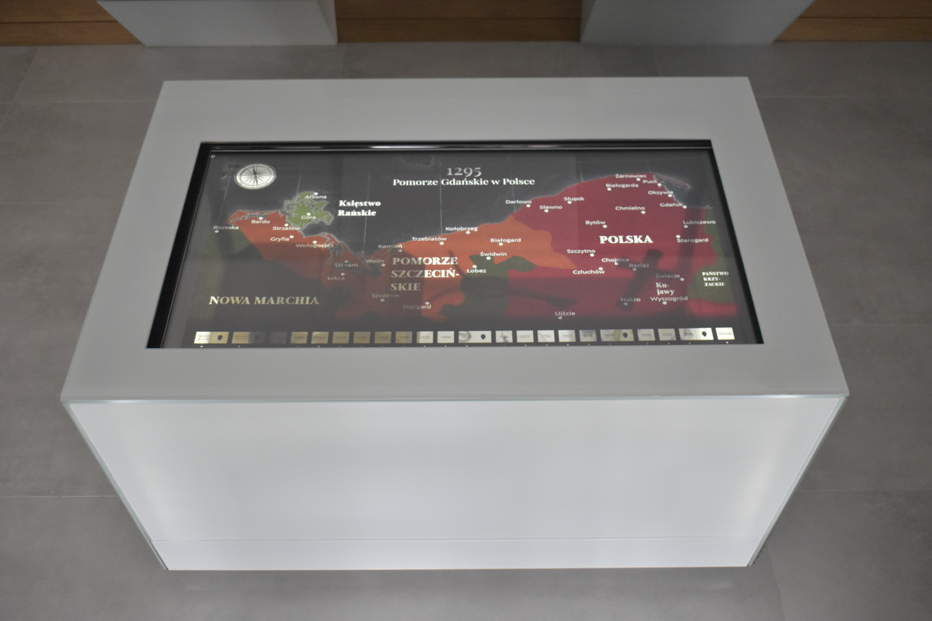 Na piętrze w Książnicy profesora Gerarda Labudy pośrodku sali wystawowej znajduje się intrygujący obiekt, to stół z pozornie nieciekawym niebieskim polem ekranowym. Wszystko zmienia się jednak po jego delikatnym dotknięciu. W pełnej krasie ukazuje się nam dotykowa, interaktywna mapa multimedialna z solidną dawką wiedzy o historii Kaszubów opowiedzianą w nieco inny sposób niż na obrotowych tablicach. Szybko spostrzeżemy, że mamy przed sobą południowe wybrzeże Bałtyku z osią czasu w przedziale od okresu przed Chrystusem aż do schyłku XX wieku. Owe daty szybko zareagują na nasz delikatny dotyk ukazując historię i trwanie Kaszubów na pomorskiej ziemi od wczesnego średniowiecza aż po współczesność. Bez problemu dowiemy się w jakich państwach i na jakim obszarze Pomorza zamieszkiwali Kaszubi w czasach piastowskich, zaborowych, w dwudziestoleciu międzywojennym, II wojny światowej jak i obecnie. Liczne dopowiedzenia w postaci ilustracji i tekstów tylko ułatwiają zrozumienie niezwykle złożonych kaszubskich dziejów. Wnikliwy obserwator dostrzeże, że i tu znalazło się miejsce dla wyjątkowych zabytków, które czekają na nasze odkrycie i poznanie. Jeśli wciąż czujemy niedosyt, gdyż zabrakło nam kojącego głosu i obrazu patrona placówki to odnajdziemy go właśnie tutaj.