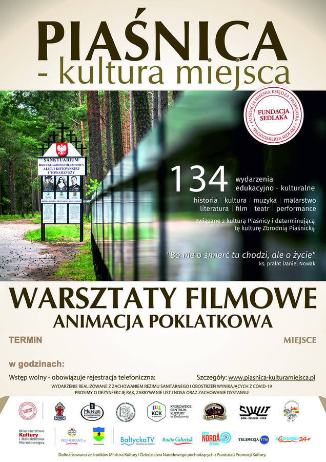 Opis warsztatów | Warsztaty filmowe – animacja poklatkowa, realizowane są w ramach projektu „Piaśnica – kultura miejsca” ukazującego Piaśnicę z różnych perspektyw kulturowych i uwzględniając jej tragiczną historię z okresu II wojny światowej – miejsce Zbrodni Piaśnickiej. Wspólne działania literatów, malarzy, muzyków, filmowców – artystów, instytucji naukowych i kulturalnych są ukierunkowane na ukazanie wielobarwnej kultury Piaśnicy przy jednoczesnym upamiętnieniu jej trudnej historii. Tłem działań jest przeszłość, a dążeniem wspólna wielokulturowa przyszłość.