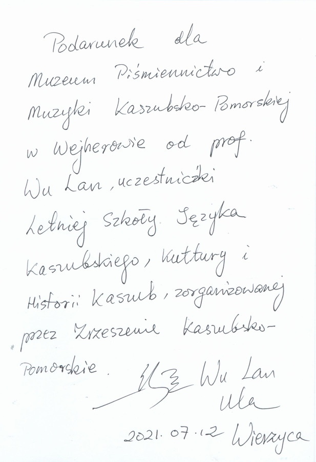 Baro czekawi i „egzoticzny” dôrënk przekôza do zbiorów Mùzeùm Kaszëbskò-Pòmòrsczi Pismieniznë i Mùzyczi we Wejrowie profesór Gduńsczégò Ùniwersytetu Wu Lan òbczas VII Latowi Szkòłë Kaszëbsczégò Jãzëka. Je to Kaszëbskò-chińsczi i chińskò-kaszëbsczi słowôrz! Ta ksążka rozbùdzëła sensacjã westrzód bëtników kùrsu i kaszëbsczich dzejôrzów. Je òna dónô do smarë bez Krësztofa S. Achingera, chtëren je miéwcą Wëdôwiznë Bohan z Kãt w Małopòlsce, jaczi zajimô sã przede wszëtczim pòlskò-chińsczima słowôrzama. Równak nakłôd béł môłi, a temù nie je ten słowôrz kòl naju znóny. Ju wnetk zaczekawiony bãdą mòglë z niego skòrzëstac w Dzélu Lëteraturë i Prasë najégò Mùzeùm. Wastnie Profesór Wu Lan serdeczno dzãkùjemë za nen dôrënk!