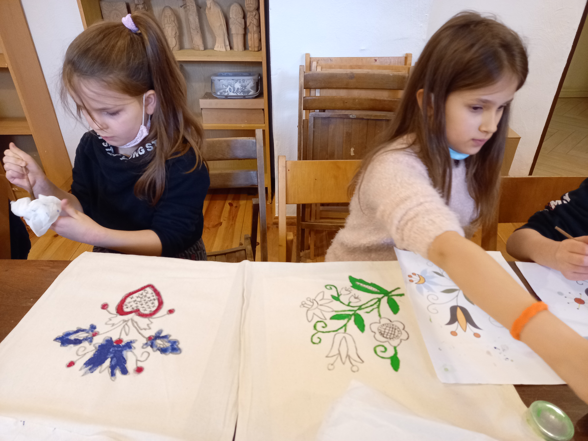 W dniu 23 lutego 2022 roku w Muzeum Piśmiennictwa i Muzyki Kaszubsko- Pomorskiej w Wejherowie, gościli uczniowie uczestniczących w półkoloniach w szkole Kreatywni S.C. z Rumi. Podczas warsztatów zdobili wzorem haftu kaszubskiego ekologiczne torby. Była to też świetna okazja ku temu, żeby powtórzyć sobie kaszubskie nazwy kolorów, przypomnieć sobie czym jest haft i na czym polega sztuka haftowania. Uczniowie mogli też eksperymentować tworząc własny układ barw w hafcie. Jednocześnie każdy zyskał przedmiot użytkowy, który z pewnością będzie mógł wykorzystać, w szkole czy na zakupach.