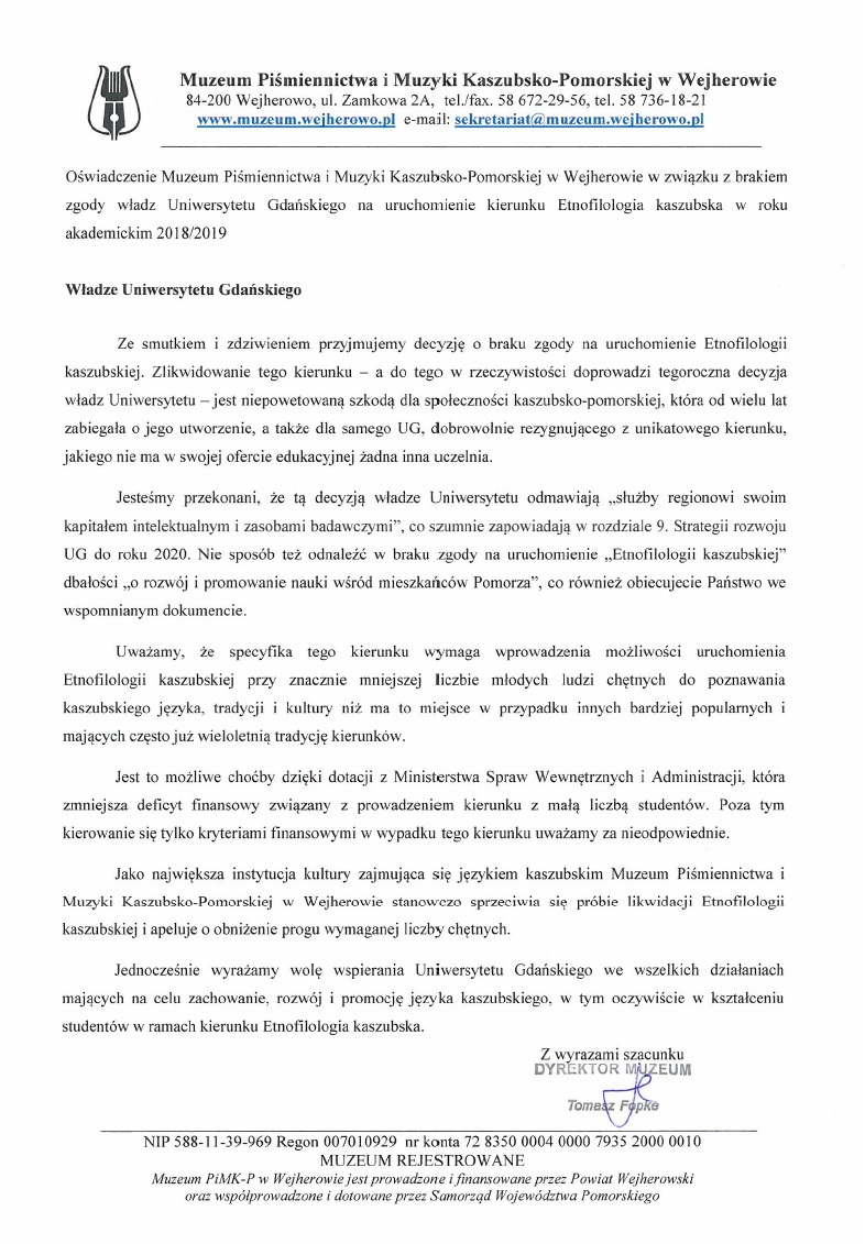 Etnofilologia kaszubska w roku akademickim 2018/2019. Oświadczenie Muzeum