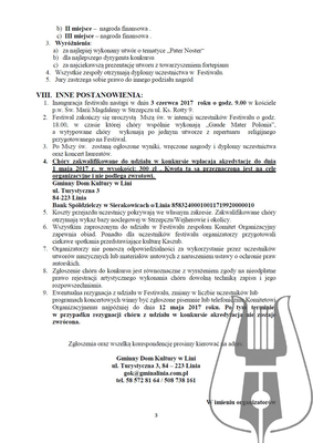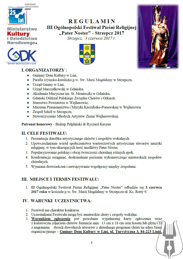 - Warunkiem zgłoszenia jest przesłanie wypełnionej karty zgłoszenia wraz z kolorowym zdjęciem chórów formacie min.: 13 cm x 18 cm oraz kasetą lub płytą CD z nagraniem dwóch dowolnych utworów z aktualnego programu chóru na adres biura organizacyjnego - Gminny Dom Kultury w Lini, ul. Turystyczna 3, 84-223 Linia, do dnia 15 kwietnia 2017 r.z dopiskiem na kopercie: III Ogólnopolski Festiwal Pieśni Religijnej „Pater Noster“.