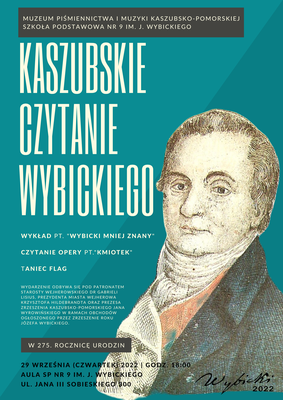 W ramach wydarzenia, które rozpocznie się o godz. 18.00, odbędzie się wykład pt. „Wybicki mniej znany” dra Piotra Kąkola, adiunkta w Instytucie Filologii Polskiej na Wydziale Filologicznym Uniwersytetu Gdańskiego, taniec flag przygotowany przez uczniów Szkoły Podstawowej nr 9 im. Józefa Wybickiego oraz wspólne czytanie mało znanej opery autorstwa J. Wybickiego pt. „Kmiotek” przez aktorów grup teatralnych działających na terenie Kaszub, tj. Amatorskiego Zespołu Teatralnego działającego przy Domu Kultury w Strzelnie, Regionalnego Teatru Dramatycznego z Luzina, Teatru „Zymk” i innych.