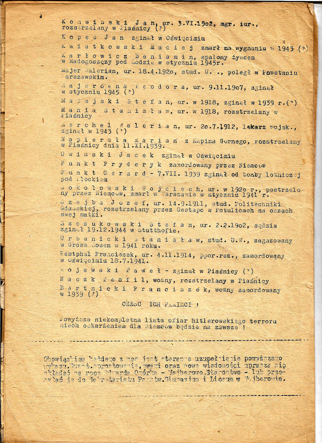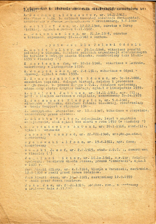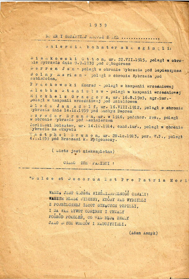 Poruszające świadectwo tragizmu II wojny światowej stanowi spis wychowawców i uczniów wejherowskiej wszechnicy poległych i pomordowanych podczas tak niedawno zakończonej wojny.