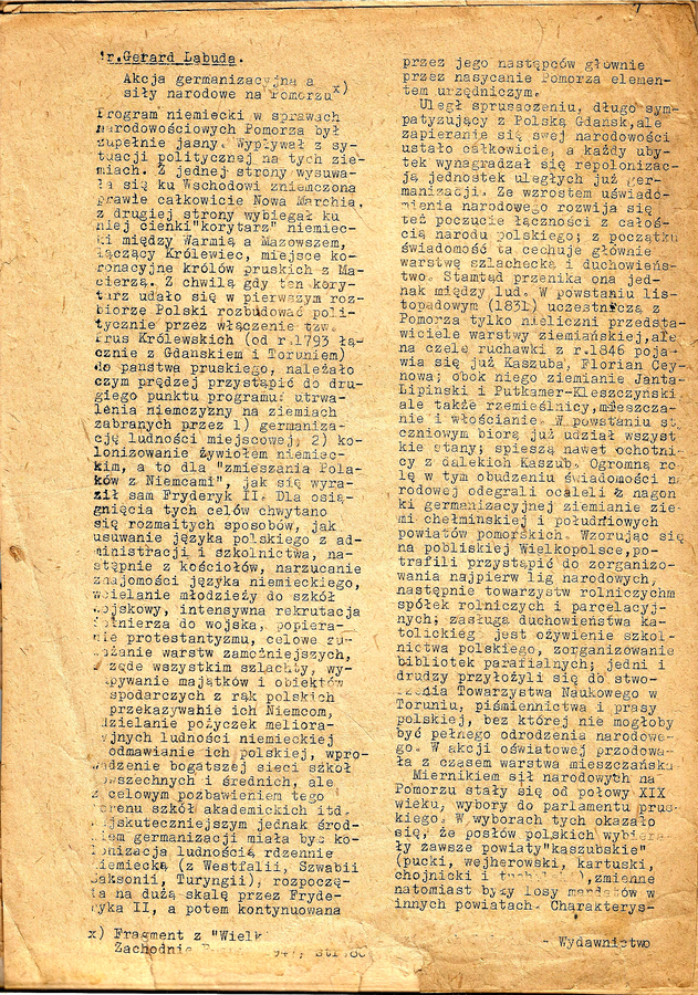 Drugi z tekstów, poświęcony akcji germanizacyjnej w XIX stuleciu na Kaszubach, napisał młody naukowiec, absolwent wejherowskiego liceum, Gerard Labuda.