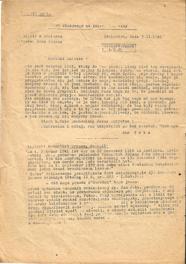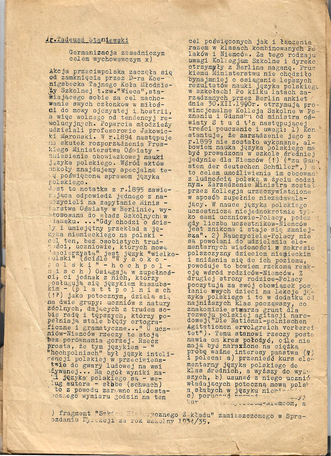 Fakt ów zdeterminował treść jednodniówki. Pierwszy z zamieszczonych w niej tekstów, autorstwa ostatniego przedwojennego dyrektora szkoły, Tadeusza Staniewskiego (który i po wojnie przez jakiś czas piastował to stanowisko), dotyczy germanizacji jako celu wychowawczego w polityce państwa prusko-niemieckiego.