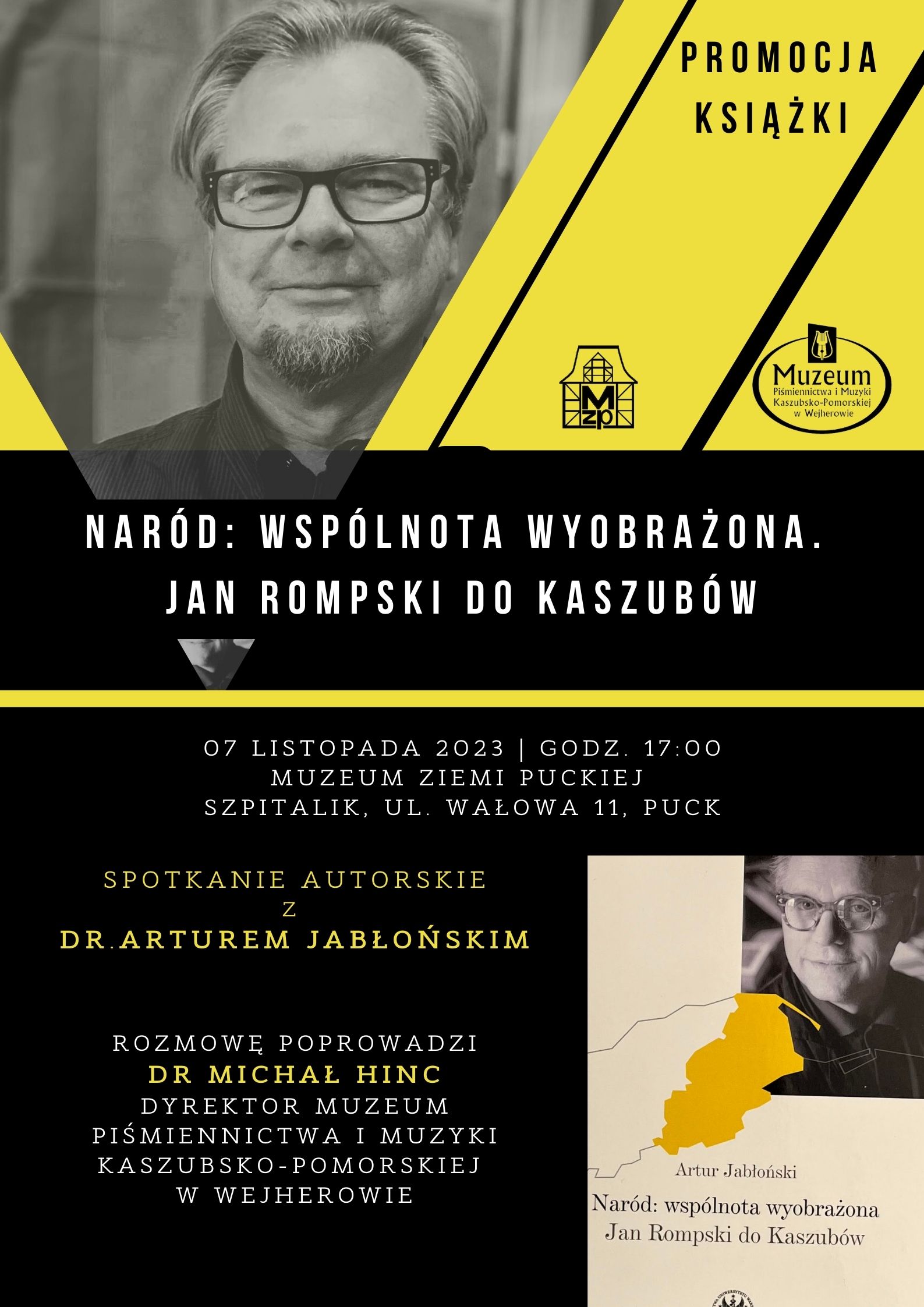 Muzeum Ziemi Puckiej im. Floriana Ceynowy i Muzeum Piśmiennictwa i Muzyki Kaszubsko-Pomorskiej w Wejherowie serdecznie zapraszają na spotkanie autorskie z Arturem Jabłońskim połączone z promocją książki pt. Naród: wspólnota wyobrażona. Jan Rompski do Kaszubów.