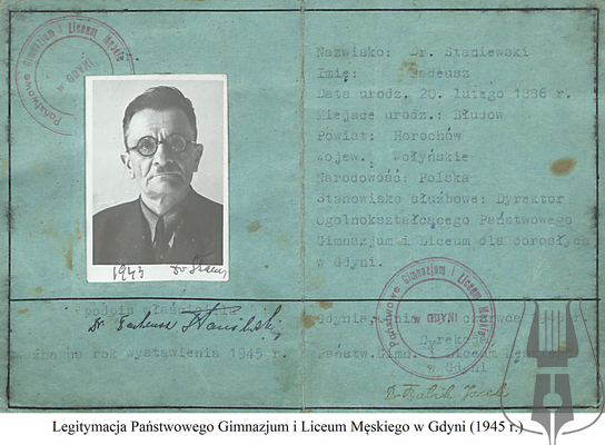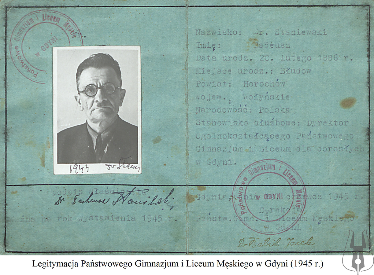 Tadeusz Staniewski urodził się 20 lutego 1886 r. w Błędowie na Wołyniu. W pobliskim Łucku uczęszczał do rosyjskiego progimnazjum. Edukację kontynuował w krakowskim gimnazjum, które ukończył w 1906 r. Dalsze kształcenie podjął na Uniwersytecie Jagiellońskim, na którym już w 1910 r. uzyskał stopień doktora filozofii. W okresie I wojny światowej został wcielony do 2 Karpackiej Brygady Legionów Polskich. Brał udział w obronie Lwowa. Tuż po zakończeniu działań wojennych został nauczycielem gimnazjum we Wrześni, następnie zorganizował szkołę średnią w Dziśnie nad Dźwiną. W lipcu 1934 r. dr Tadeusz Staniewski został dyrektorem Państwowego Gimnazjum i Liceum im. Króla Jana Sobieskiego w Wejherowie. Oprócz zawodowych obowiązków czynnie zaangażował się w działalność społeczną. Pisał i publikował teksty na temat historii Wejherowa, żywo interesował się przeszłością gimnazjum. Dwukrotnie został wybrany prezesem miejscowego oddziału Polskiego Związku Zachodniego. Dyrektorem wejherowskiej placówki oświatowej był aż do wybuchu wojny. Warto wspomnieć, że jego nazwisko znalazło się na liście osób przeznaczonych do eksterminacji. Staniewski szczęśliwie uniknął tragicznego losu, ponieważ okres wojny spędził w Krakowie, gdzie nauczał w tzw. tajnych kompletach. Po wojnie powrócił do Wejherowa w nadziei, że obejmie piastowane przed wojną stanowisko pracy. Otrzymał je dopiero w 1947 r. Już w 1950 r. w wyniku przeprowadzonych przez komunistyczne władze czystek kadrowych został zwolniony i skierowany na emeryturę. Nie pozostał jednak biernym obserwatorem otaczającej go rzeczywistości. Zorganizował wejherowskie Archiwum Państwowe i był jego kierownikiem w latach 1950-1956. Wkrótce potem został członkiem Zrzeszenia Kaszubskiego. Zmarł w Wejherowie 12 grudnia 1978 r., został pochowany na śmiechowskim cmentarzu.