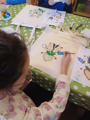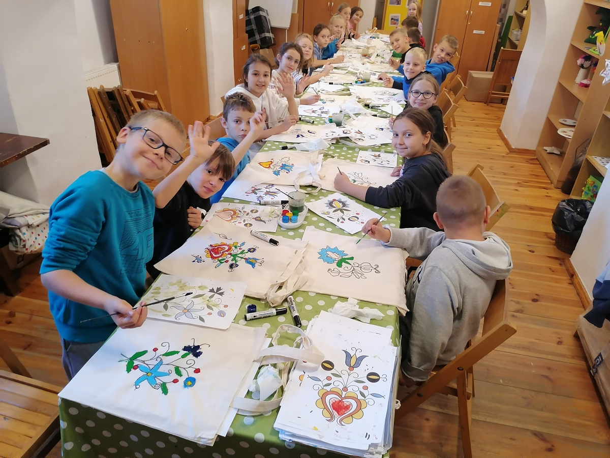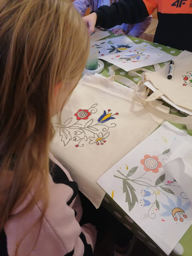 Podczas wizyty młodzi artyści wzięli udział w warsztatach malarstwa na torbach, które poprowadziła Pani Ania. Każdy z uczestników ozdobił swoją torbę pięknymi motywami kaszubskimi – powstały prawdziwe dzieła sztuki!