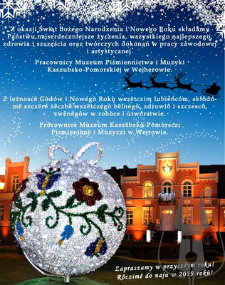 Muzeum Piśmiennictwa i Muzyki Kaszubsko-Pomorskiej w Wejherowie składa Państwu najlepsze życzenia z okazji Świąt Bożego Narodzenia i Nowego Roku.