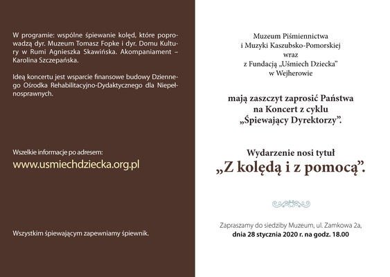 Muzeum Piśmiennictwa i Muzyki Kaszubsko-Pomorskiej wraz z Fundacją „Uśmiech Dziecka” w Wejherowie mają zaszczyt zaprosić Państwa na II Koncert z cyklu „Śpiewający Dyrektorzy”, który nosi tytuł „Z kolędą i z pomocą”.
