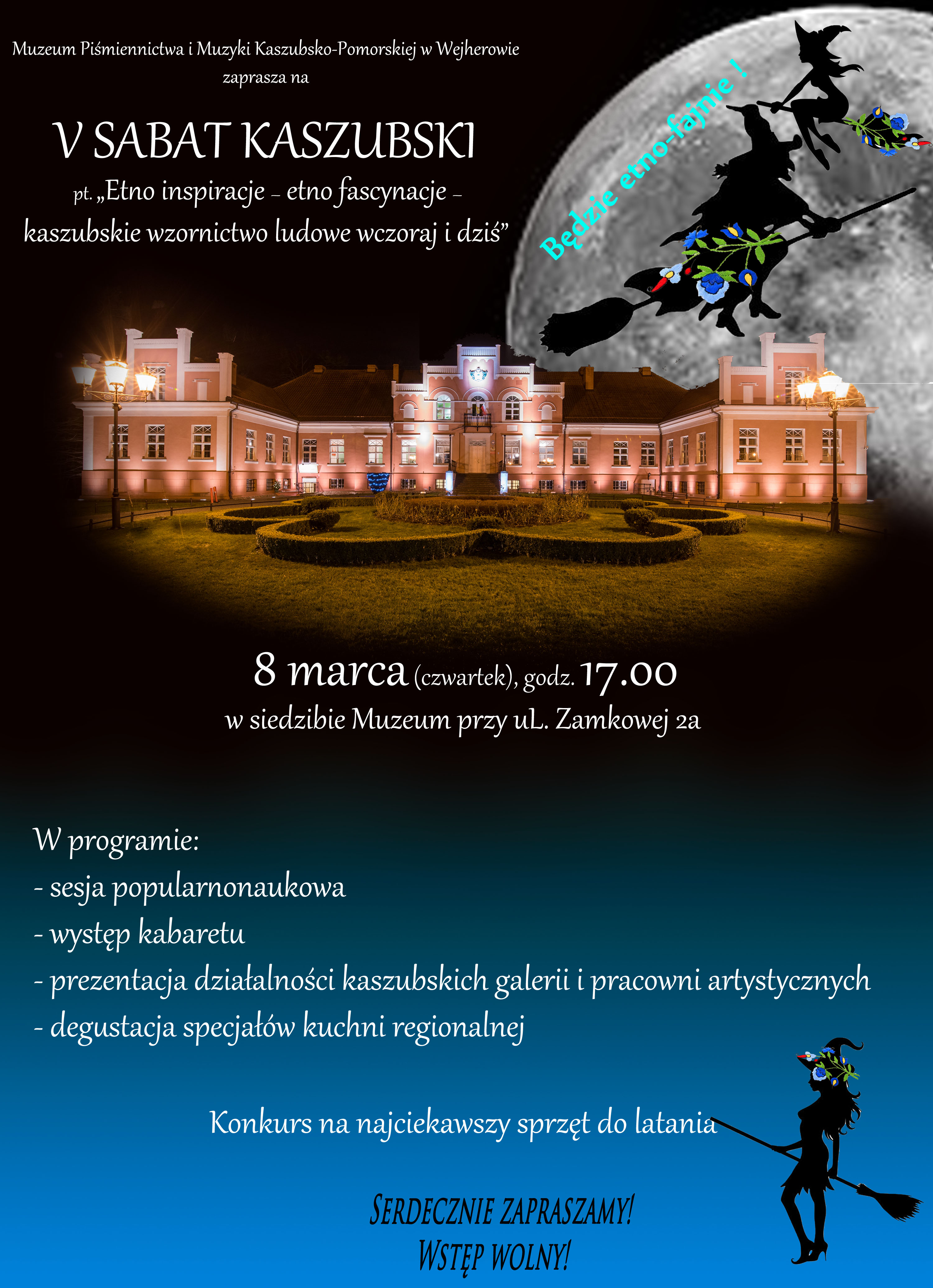 Muzeum Piśmiennictwa i Muzyki Kaszubsko-Pomorskiej w Wejherowie serdecznie zaprasza na sesję popularnonaukową w ramach obchodów V SABATU KASZUBSKIEGO. Tegoroczna edycja poświęcona zagadnieniom etnodesignu kaszubskiego pt. „Etno inspiracje – etno fascynacje – kaszubskie wzornictwo ludowe wczoraj i dziś”.
