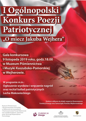 Muzeum Piśmiennictwa i Muzyki Kaszubsko-Pomorskiej w Wejherowie serdecznie zaprasza na uroczyste rozstrzygnięcie 1 Ogólnopolskiego Konkursu Poezji Patriotycznej „O miecz Jakuba Wejhera”, 9 listopada (sobota) 2019 r., o godz. 18.00, w siedzibie Muzeum przy ulicy Zamkowej 2a.
